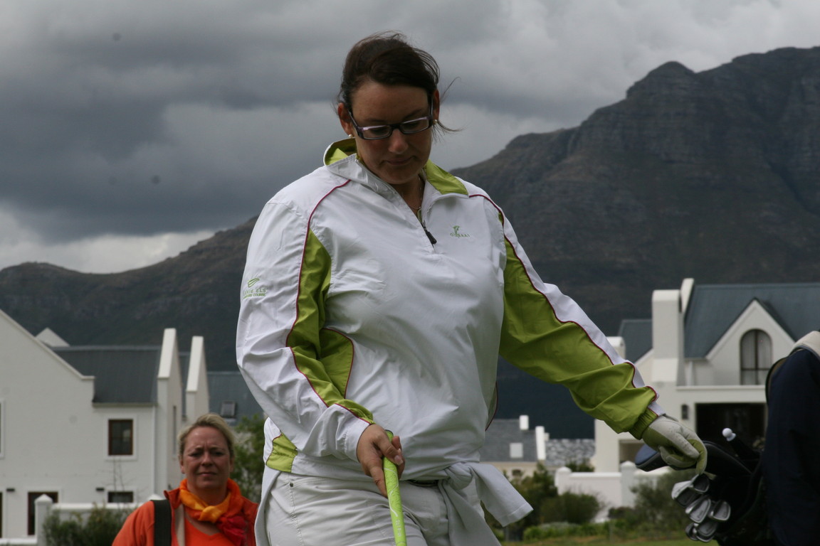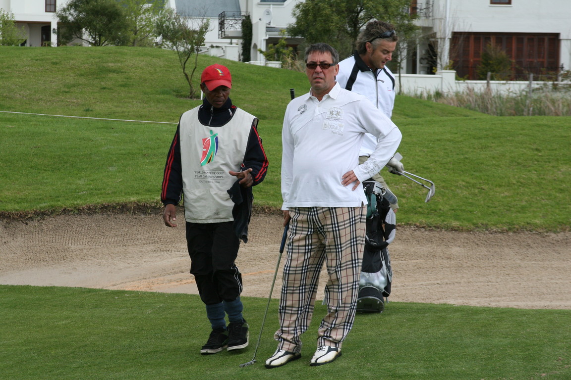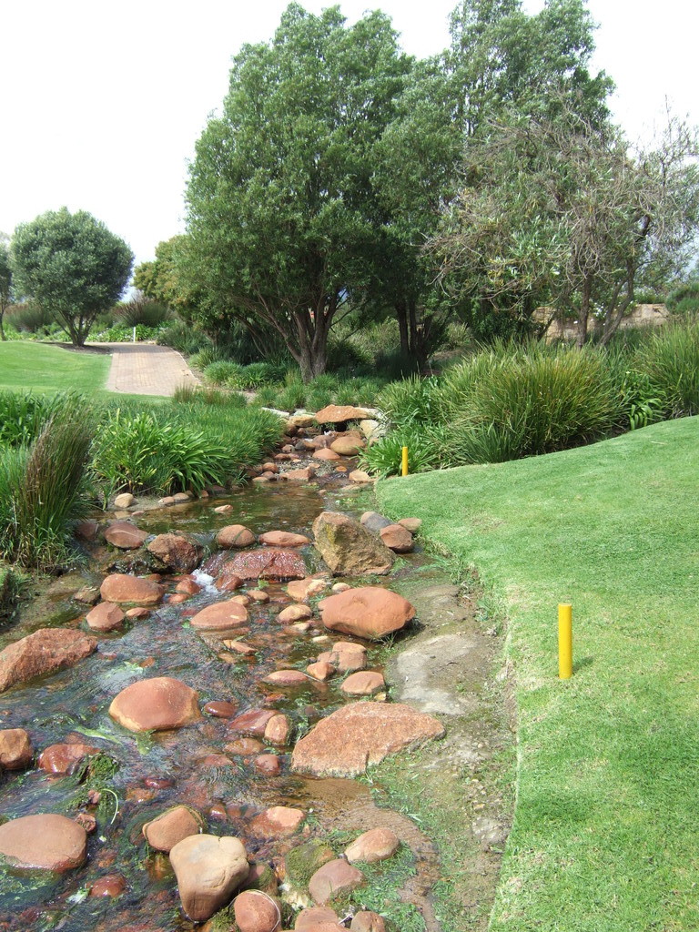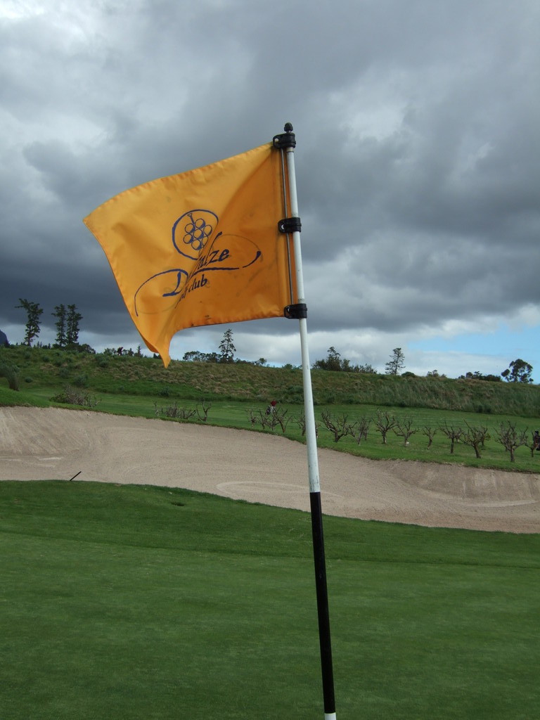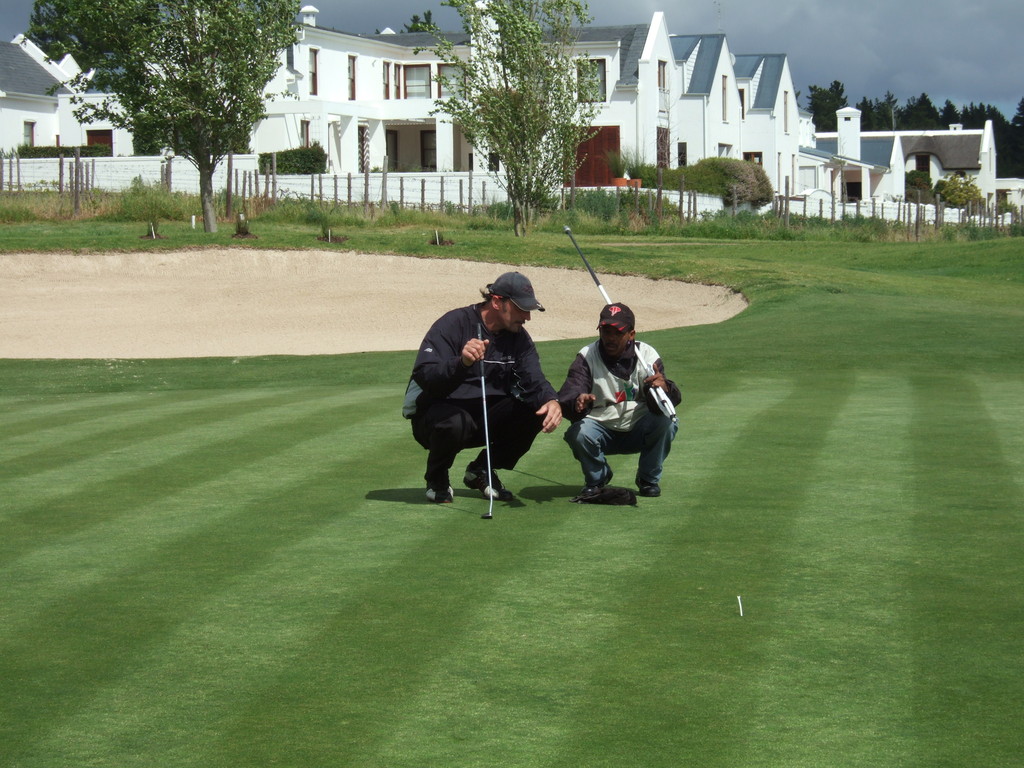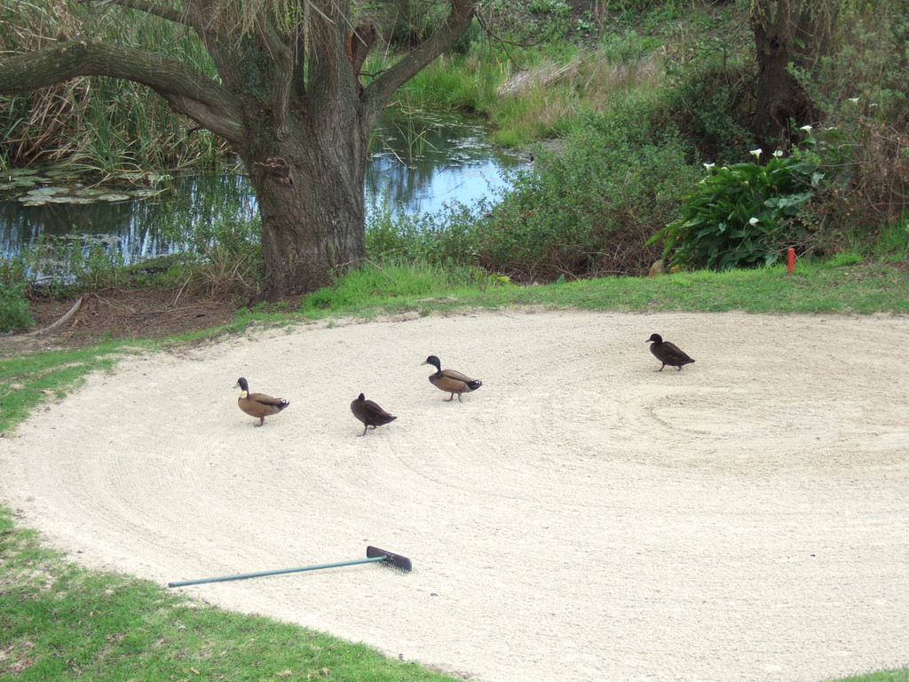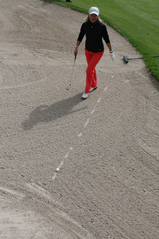 In Südafrika werden die Bunkerharken nicht wie bei uns längs der Bunkerkante in den Sand gelegt, sondern es gibt spezielle Bodenhülsen nahe dem Bunker, in die die Harke senkrecht gesteckt wird. So bietet die Harke weniger Angriffsfläche und man muß sich nicht zum Aufheben bücken.