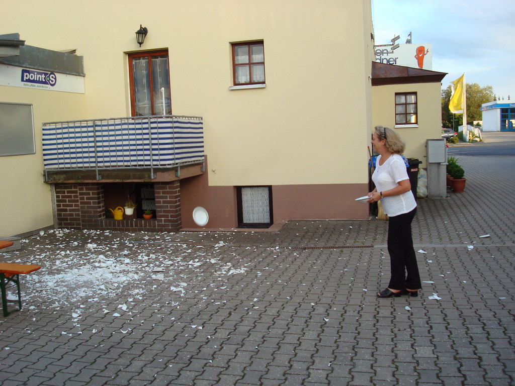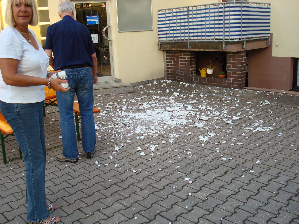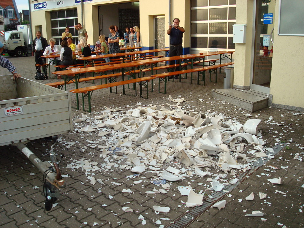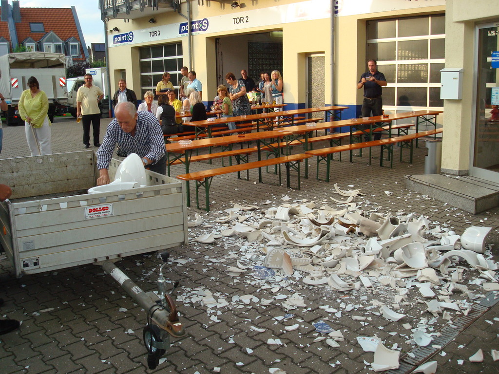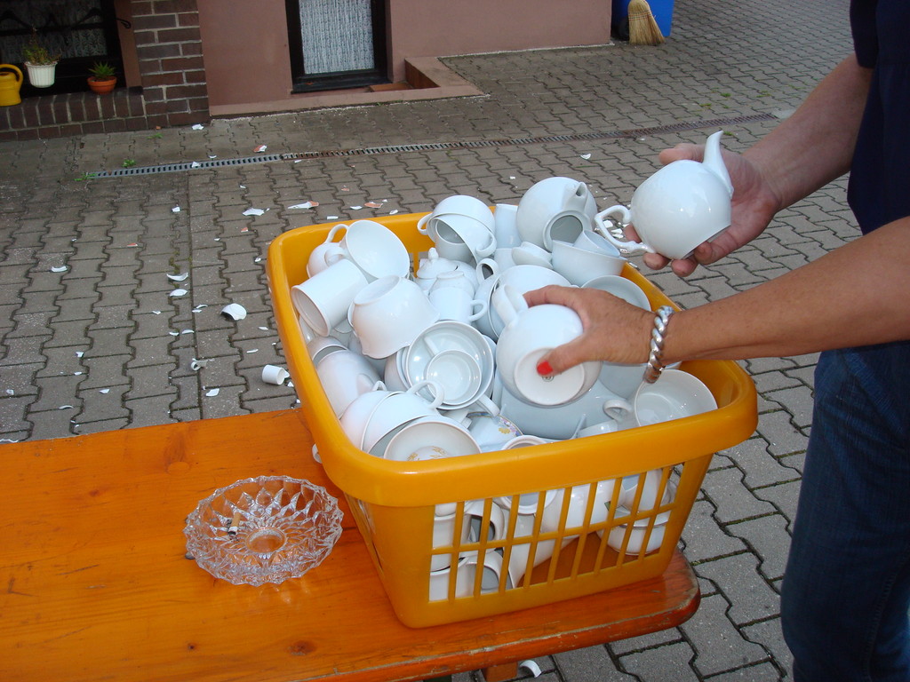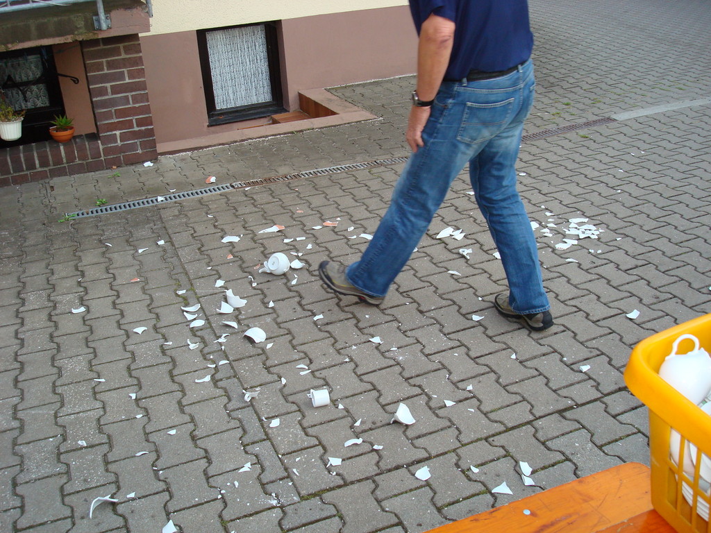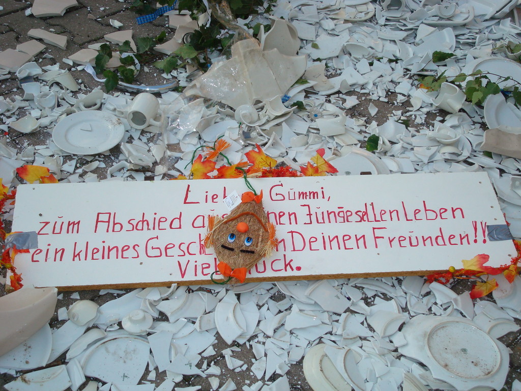 Heute wurden wir mit einem supergeheimen Polterabend überrascht. Gudula hatte die Idee dazu, Jan organisierte alles, Kalle machte das Catering und wir waren sprachlos als auf einmal ca. 40 Freunde im Hof mit Porzellan und Geschirr um sich warfen. Vielen "Dank" auch an Kalle für eine ganze Ladung aus dem Traktor. Da fällt mir doch wieder ein guter englischer Spruch ein: "I believe I spider."